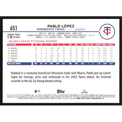 This is a 2024 Topps Pablo Lopez baseball card. The card is #651 and pictures show condition.