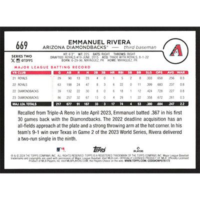 This is a 2024 Topps Emmanuel Rivera baseball card. The card is #669 and pictures show condition.