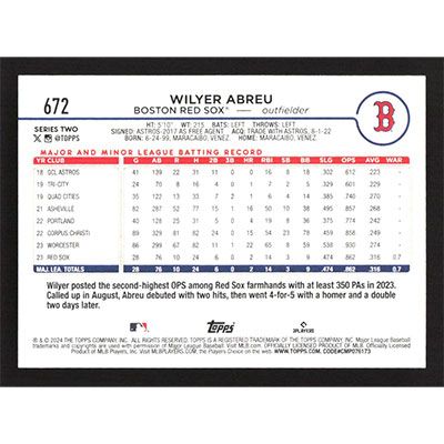 This is a 2024 Topps Wilyer Abreu baseball card. The card is #672 and pictures show condition.