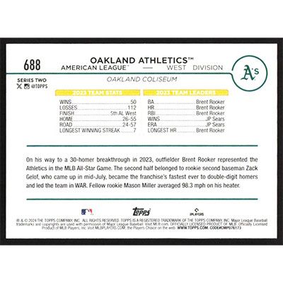 This is a 2024 Topps Oakland Athletics Team Card baseball card. The card is #688 and pictures show condition.