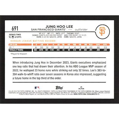 This is a 2024 Topps Jung Hoo Lee baseball card. The card is #691 and pictures show condition.