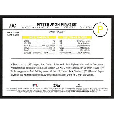 This is a 2024 Topps Pittsburgh Pirates Team Card baseball card. The card is #696 and pictures show condition.