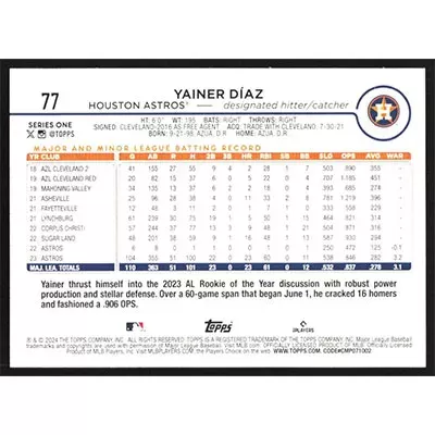 This is a 2024 Topps Yanier Diaz baseball card. The card is #77 and pictures show condition.