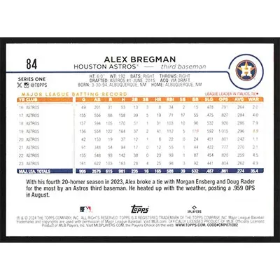 This is a 2024 Topps Alex Bregman baseball card. The card is #84 and pictures show condition.