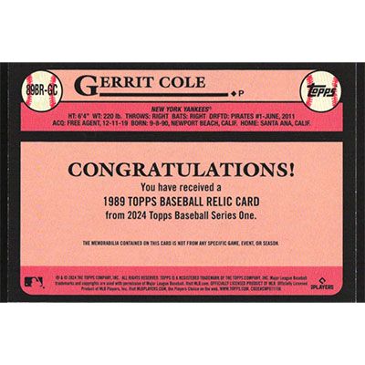 This is a 2024 Topps '89 Relics Gerrit Cole Jersey baseball card. The card is #89BR-GC and pictures show condition.