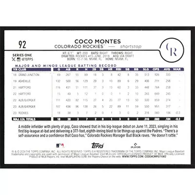 This is a 2024 Topps Coco Montes baseball card. The card is #92 and pictures show condition.