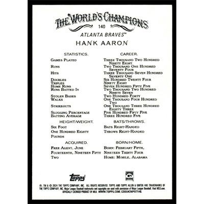 This is a 2024 Topps Allen & Ginter Hank Aaron baseball card. The card is #140 and pictures show condition.