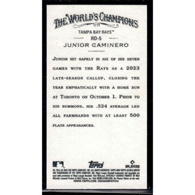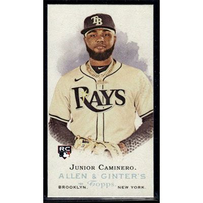 This is a 2024 Topps Allen & Ginter Mini Rookie Design Variations Junior Caminero baseball card. The card is #RD-5 and pictures show condition. Team(s): Tampa Bay Rays Rookie Card (RC)