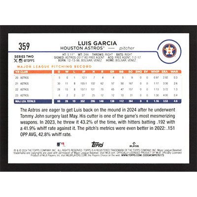 This is a 2024 Topps Black Crackle Foil Luis Garcia baseball card. The card is #359 and pictures show condition.