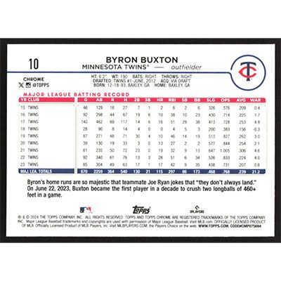 This is a 2024 Topps Chrome Byron Buxton baseball card. The card is #10 and pictures show condition.