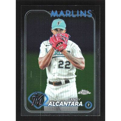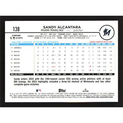 This is a 2024 Topps Chrome Sandy Alcantara baseball card. The card is #138 and pictures show condition.