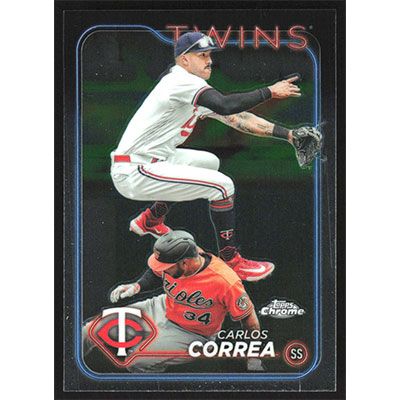 This is a 2024 Topps Chrome Carlos Correa baseball card. The card is #156 and pictures show condition.