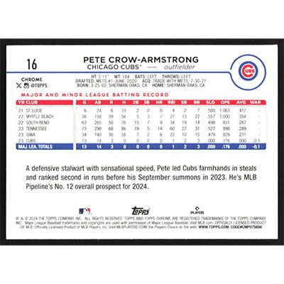 This is a 2024 Topps Chrome Pete Crow-Armstrong baseball card. The card is #16 and pictures show condition.
