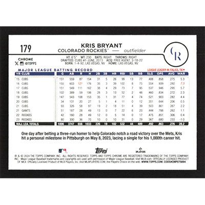 This is a 2024 Topps Chrome Kris Bryant baseball card. The card is #179 and pictures show condition.