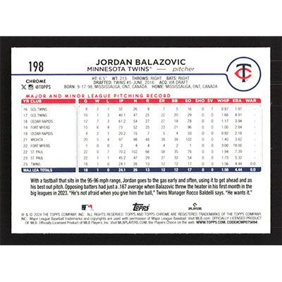 This is a 2024 Topps Chrome Jordan Balazovic baseball card. The card is #198 and pictures show condition.