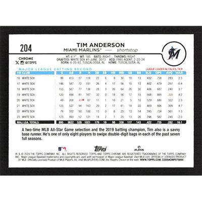 This is a 2024 Topps Chrome Tim Anderson baseball card. The card is #204 and pictures show condition.