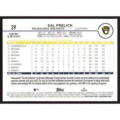 This is a 2024 Topps Chrome Sal Frelick baseball card. The card is #39 and pictures show condition.
