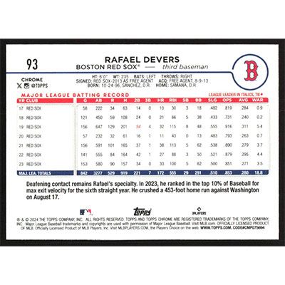This is a 2024 Topps Chrome Rafael Devers baseball card. The card is #93 and pictures show condition.