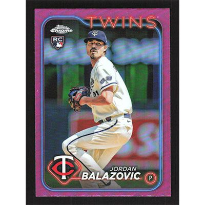 This is a 2024 Topps Chrome Pink Refractors Jordan Balazovic baseball card. The card is #198 and pictures show condition. Team(s): Minnesota Twins Rookie Card (RC)