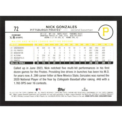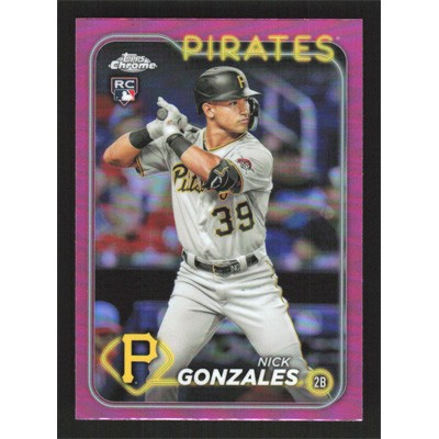 This is a 2024 Topps Chrome Pink Refractors Nick Gonzales baseball card. The card is #72 and pictures show condition. Team(s): Pittsburgh Pirates Rookie Card (RC)