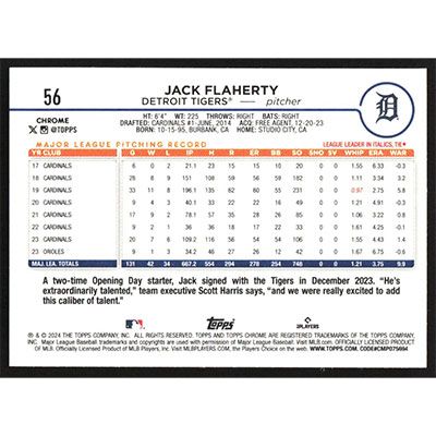 This is a 2024 Topps Chrome Prism Refractors Jack Flaherty baseball card. The card is #56 and pictures show condition.