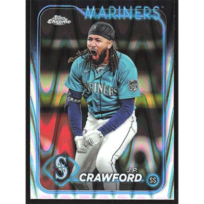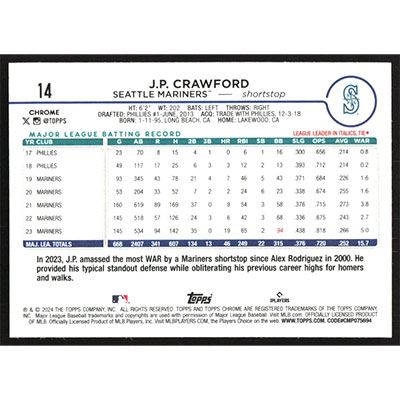 This is a 2024 Topps Chrome RayWave Refractors J.P. Crawford baseball card. The card is #14 and pictures show condition.