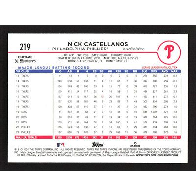 This is a 2024 Topps Chrome RayWave Refractors Nick Castellanos baseball card. The card is #219 and pictures show condition. Team(s): Philadelphia Phillies