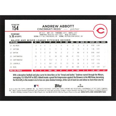 This is a 2024 Topps Chrome Refractors Andrew Abbott baseball card. The card is #154 and pictures show condition. Team(s): Cincinnati Reds Rookie Card (RC)