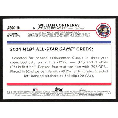 This is a 2024 Topps Chrome Update '24 All-Star Game William Contreras baseball card. The card is #ASGC-10 and pictures show condition.