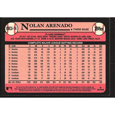 This is a 2024 Topps Chrome Update '89 Nolan Arenado baseball card. The card is #89CU-14 and pictures show condition.