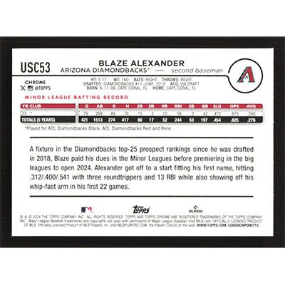 This is a 2024 Topps Chrome Update Magenta Refractors Blaze Alexander baseball card. The card is #USC53 and pictures show condition. This card is limited; #'d 130/399.