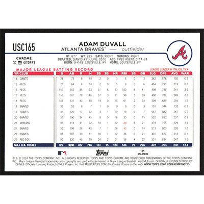 This is a 2024 Topps Chrome Update Orange Refractors Adam Duvall baseball card. The card is #USC165 and pictures show condition. This card is limited; #'d 21/25.