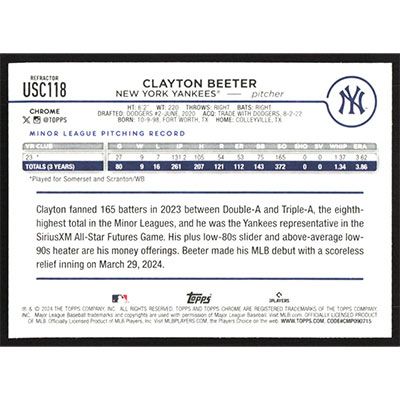 This is a 2024 Topps Chrome Update Prism Refractors Clayton Beeter baseball card. The card is #USC118 and pictures show condition.