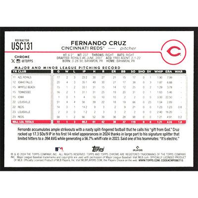 This is a 2024 Topps Chrome Update Prism Refractors Fernando Cruz baseball card. The card is #USC131 and pictures show condition.