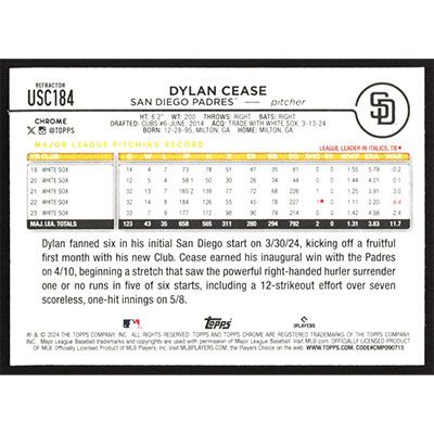 This is a 2024 Topps Chrome Update Prism Refractors Dylan Cease baseball card. The card is #USC184 and pictures show condition.