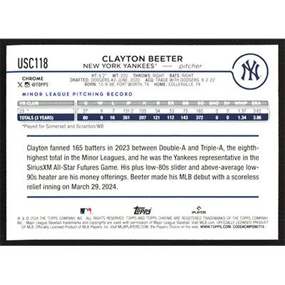 This is a 2024 Topps Chrome Update RayWave Refractors Clayton Beeter baseball card. The card is #USC118 and pictures show condition.