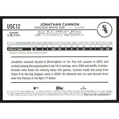 This is a 2024 Topps Chrome Update RayWave Refractors Jonathan Cannon baseball card. The card is #USC12 and pictures show condition.
