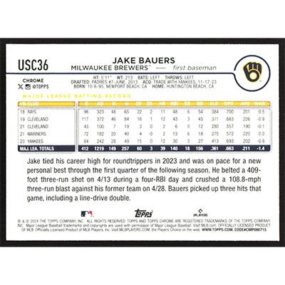 This is a 2024 Topps Chrome Update RayWave Refractors Jake Bauers baseball card. The card is #USC36 and pictures show condition.
