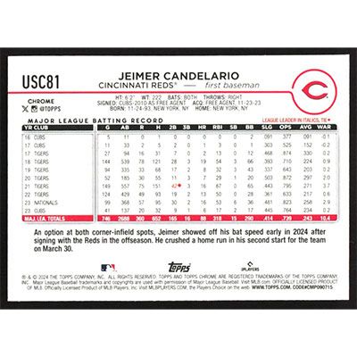 This is a 2024 Topps Chrome Update RayWave Refractors Jeimer Candelario baseball card. The card is #USC81 and pictures show condition.