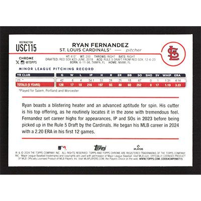 This is a 2024 Topps Chrome Update Refractors Ryan Fernandez baseball card. The card is #USC115 and pictures show condition. Team(s): St. Louis Cardinals Rookie Card (RC)