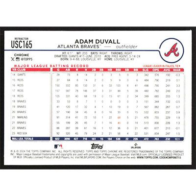 This is a 2024 Topps Chrome Update Refractors Adam Duvall baseball card. The card is #USC165 and pictures show condition.