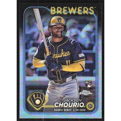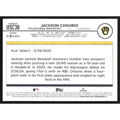 This is a 2024 Topps Chrome Update Refractors Jackson Chourio Rookie Debut baseball card. The card is #USC30 and pictures show condition.