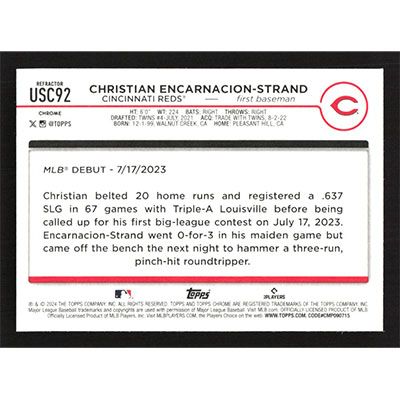 This is a 2024 Topps Chrome Update Refractors Christian Encarnacion-Strand Rookie Debut baseball card. The card is #USC92 and pictures show condition. Team(s): Cincinnati Reds Rookie Card (RC)