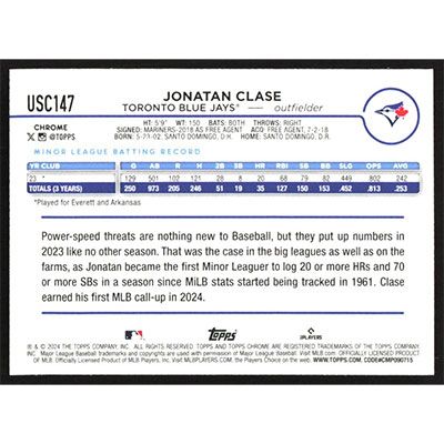 This is a 2024 Topps Chrome Update Jonatan Clase baseball card. The card is #USC147 and pictures show condition.