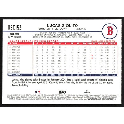 This is a 2024 Topps Chrome Update Lucas Giolito baseball card. The card is #USC152 and pictures show condition.