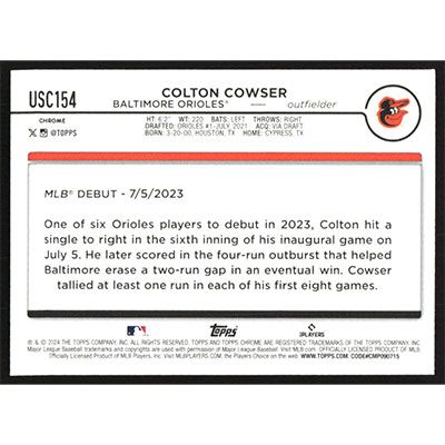 This is a 2024 Topps Chrome Update Colton Cowser Rookie Debut baseball card. The card is #USC154 and pictures show condition.