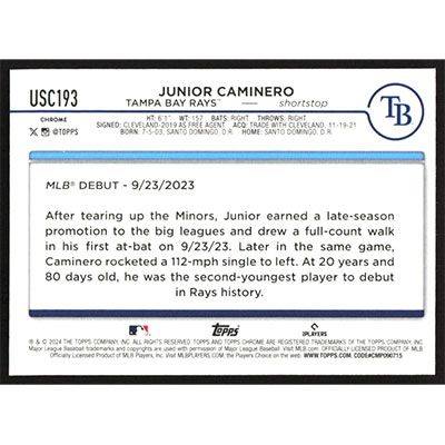 This is a 2024 Topps Chrome Update Junior Caminero Rookie Debut baseball card. The card is #USC193 and pictures show condition.