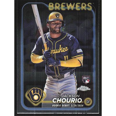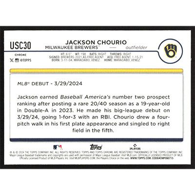 This is a 2024 Topps Chrome Update Jackson Chourio Rookie Debut baseball card. The card is #USC30 and pictures show condition.