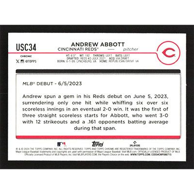 This is a 2024 Topps Chrome Update Andrew Abbott Rookie Debut baseball card. The card is #USC34 and pictures show condition.