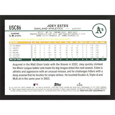 This is a 2024 Topps Chrome Update Joey Estes baseball card. The card is #USC86 and pictures show condition. Team(s): Oakland Athletics Rookie Card (RC)